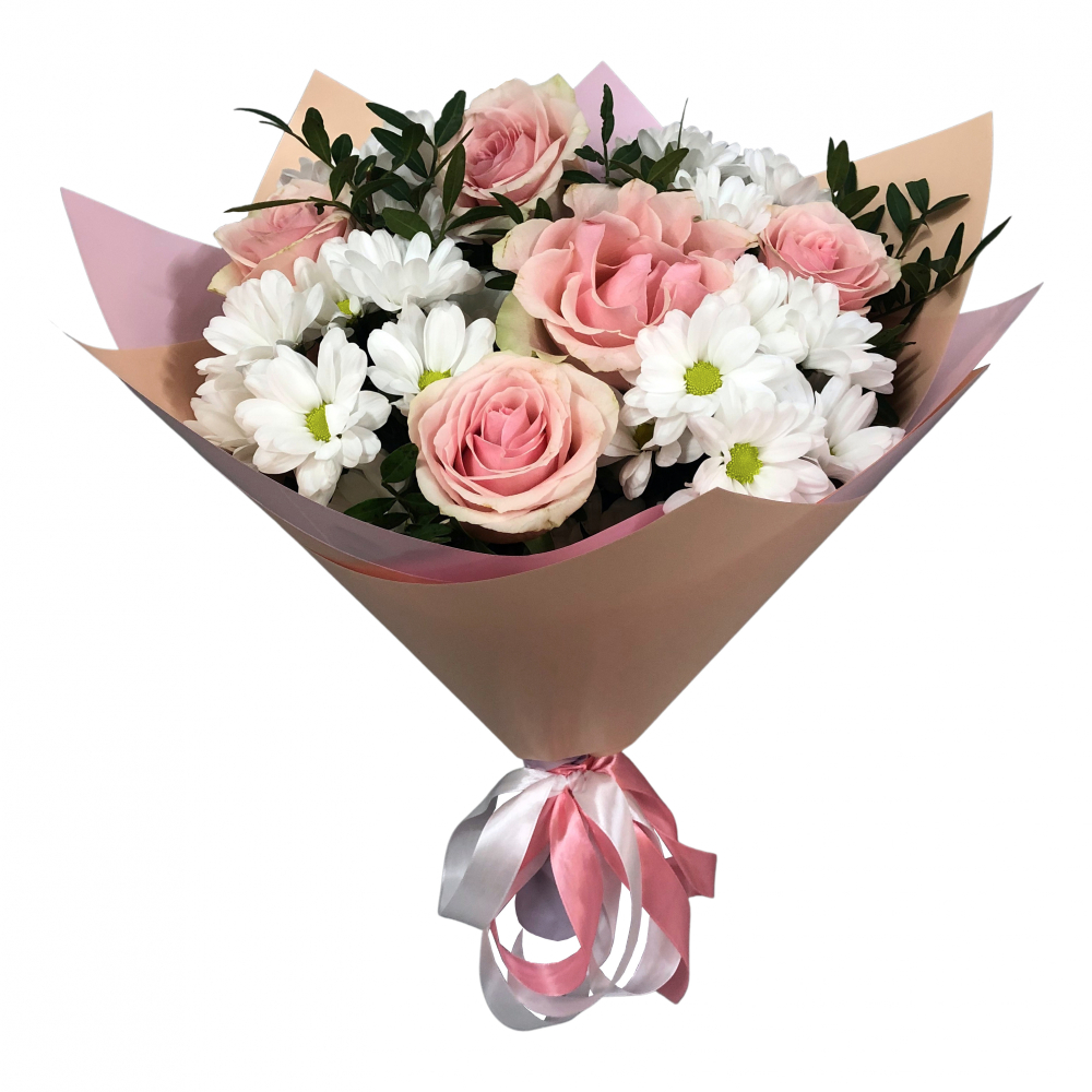 Очаровательный букет сочетает нежно-розовые розы и пышные хризантемы, создавая идеальный баланс между романтикой и практичностью. Эти свежие цветы будут радовать своей красотой долгое время. Идеальный выбор для особого признания или теплого поздравления. Магазин цветов Белая Калитва.