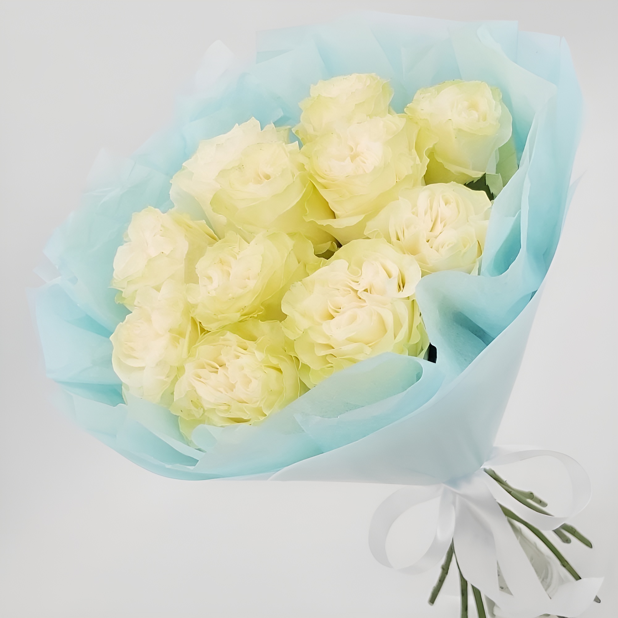 Воздушная композиция из 11 белоснежных эквадорских роз в обрамлении матовой плёнки и нежного тишью.